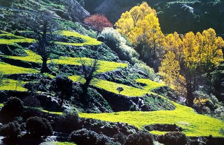 La singularidad de este paisaje viene dada porque las tierras de labor, hazas y bancales, cuelgan de las laderas de las montañas, sostenidas por “muros de piedra seca”, llamados balates y regados estas tierras por ACEQUIAS que a modo de arterias, recorren la ladera conduciendo y distribuyendo el agua desde el río hasta el último rincón del valle.