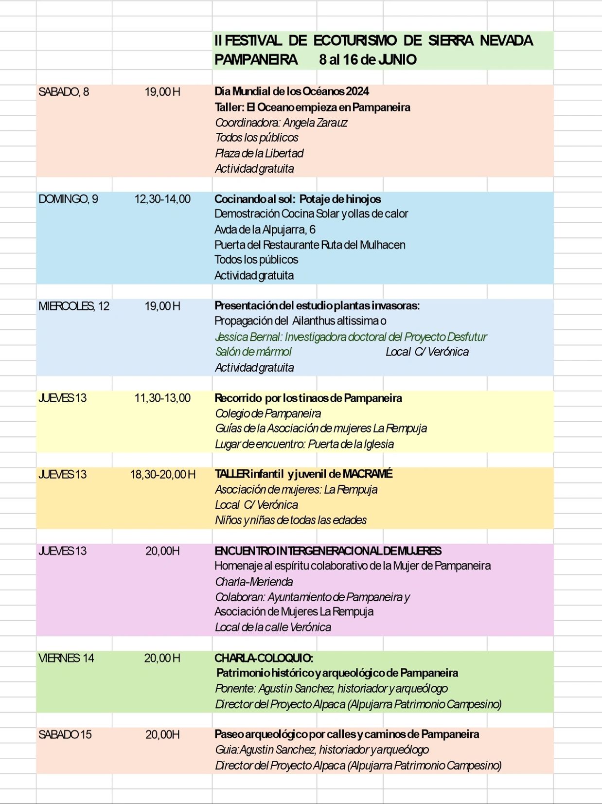 El Ayuntamiento de Pampaneira, la Asociación de Mujeres La Rempuja y el grupo de estudios ALPACA (Alpujarra Patrimonio Campesino) y el Restaurante Ruta del Mulhacen , han colaborado para organizar ocho experiencias únicas de auténtico ecoturismo que tendrán lugar desde el día 8 hasta el 16 de junio de 2024 en Pampaneira.